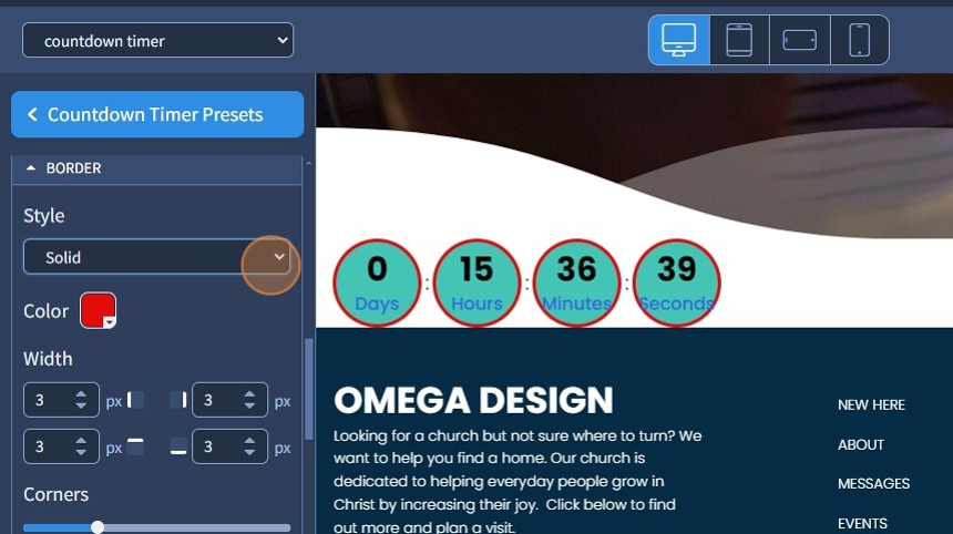 5. If needed, add a border for the Countdown Timer widget. Specify Style (solid, dashed, or dotted), add Color, and specify Width and Corners. If you need a specific color, use the Color Picker