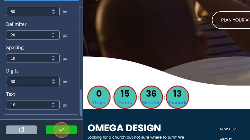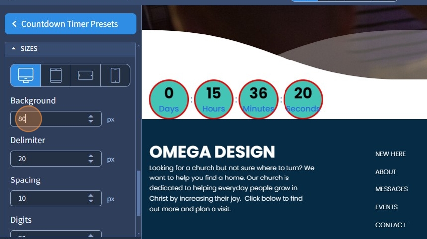 6. You can configure the following spacings and sizes for the Countdown Timer widget: Background, Delimiter, Spacing, Digits, Text