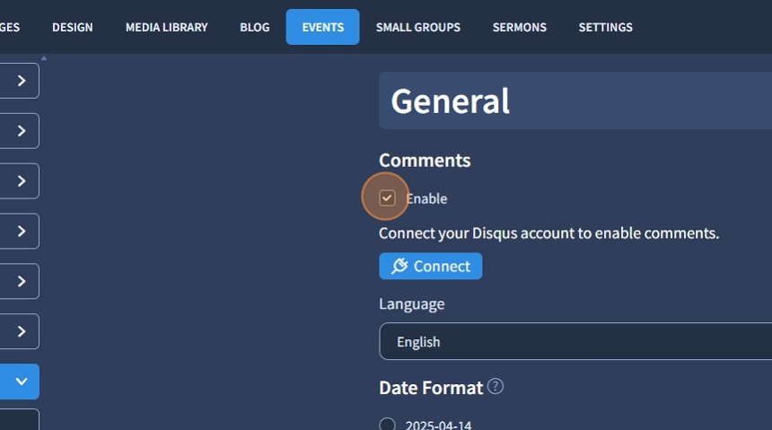 1. Settings - General tab allows you to enable comments for Events extension and select a date format