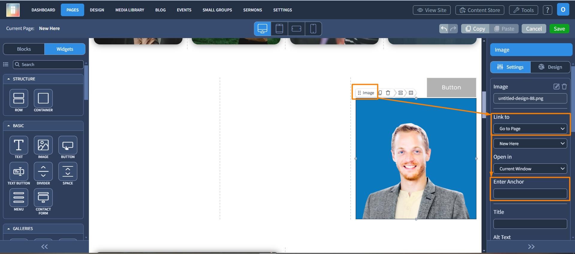 10. If you wish to enable the "Anchor" feature for the "Image" widget, select the "Image" widget on the page, open the "Settings" tab on the right, and enter a unique Anchor ID in the "Enter Anchor" field.
